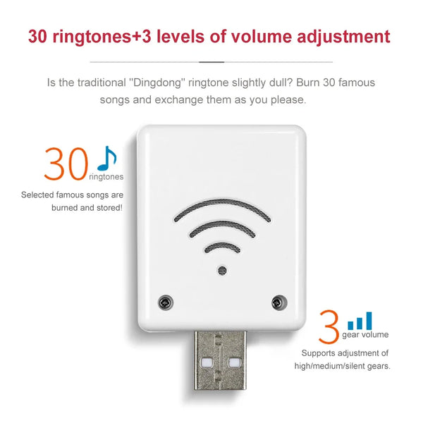 ![]() USB Emergency Call Button Strong Signal Intelligent Door Chime One-key Alarm Wireless Emergency Doorbell Remote Control for Home Feature: Specification: Origin: Mainland China Model Number: Wireless Doorbell Number of music: 30 songs Output mode; Speaker Demodulation mode: ASK Shell material: ABS Control mode: matching remote control Size: 56.5 x 33 x 5.3mm/2.22 x 1.3 x 0.2inch (without case) Product weight: 8g (without shell, with speaker) Operating voltage: DC5V/1A Standby current: 4.6mA Operating current: 120mA Receiving sensitivity: -105dB Operating temperature: -20-70°C Note: ![]()