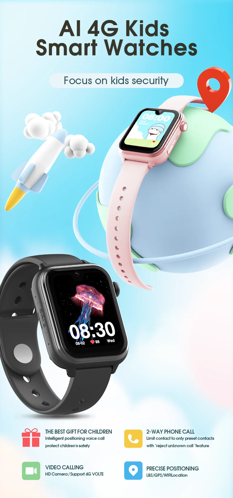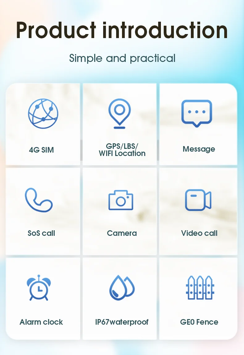 4G Smartwatch for Kids: Supports 4G network, WiFi, calendar, 1 cameras, album, two-way call, video call, GPS tracker, SMS, voice message, SOS, pedometer, class schedule, do not disturb (class mode), alarm clock, reject unknown call, music player, video player, calculator, calendar, etc.