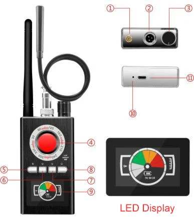 The ① on left side is the Antenna Interface, please install antenna when using the equipmentThe ②on middle is Magnetic Probe Interface, mainly used for magnetic attraction products with strong concealment, such as Positioner, Eavesdropper, etc.The ③ on right is Power and Wireless Detection Switch ( Rotate to the right, can be adjusted sensitivity)The ④ is Window / Azimuth dia, this window use the special filter lens, and the function of this filter lens is scanning hidden wired or wireless cameras with LED infrared laser technology.The ⑤ is Vibration and Ring mode switching key.The ⑥is High-intensity magnetic detection switch, when LED showed standby mode, the red light on the under is lighting.The ⑦is Camera Detection Switch, three gears adjustable.The ⑧ is Intelligent Detection Mode Key.The ⑨is LED screen ( Code-meter Signal intensity indicator and electricity display)The ⑩ is Charging indicator light (when the full charge, the light will off)
