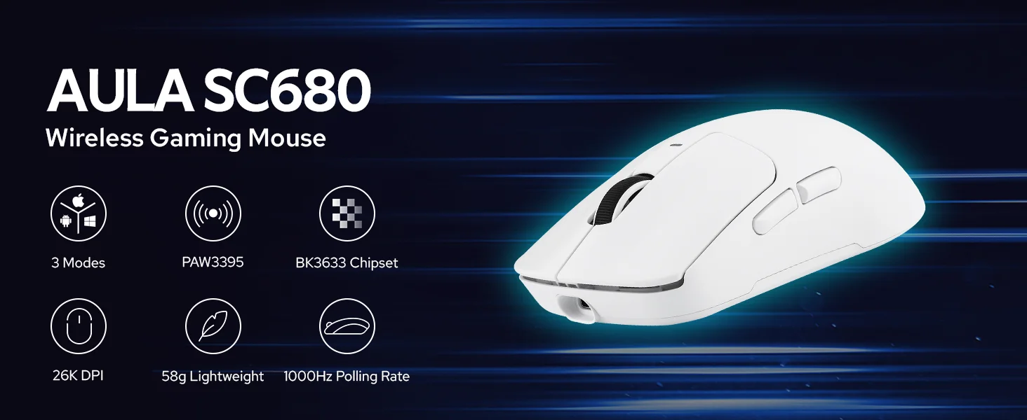【High-Performance Broadcom BK3633 Master Control Chipset】 Paired with the gaming-grade PAW3395 sensor, the Broadcom BK3633 master control chipset enhances the performance of the AULA SC680. This powerful combination ensures seamless operation, whether you're gaming or working.