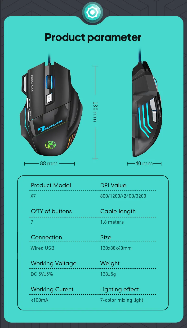 SPECIFICATIONSBattery Included: NoBrand Name: NexusClickChoice: yesDPI: 2400Hand Orientation: RightHign-concerned Chemical: NoneInterface Type: USBNumber of Buttons: 6Number of Rollers: 1 pcsOperation Mode: Opto-electronicOrigin: Mainland ChinaPackage: YesStyle: DPI adjust button,BacklightType: Wired