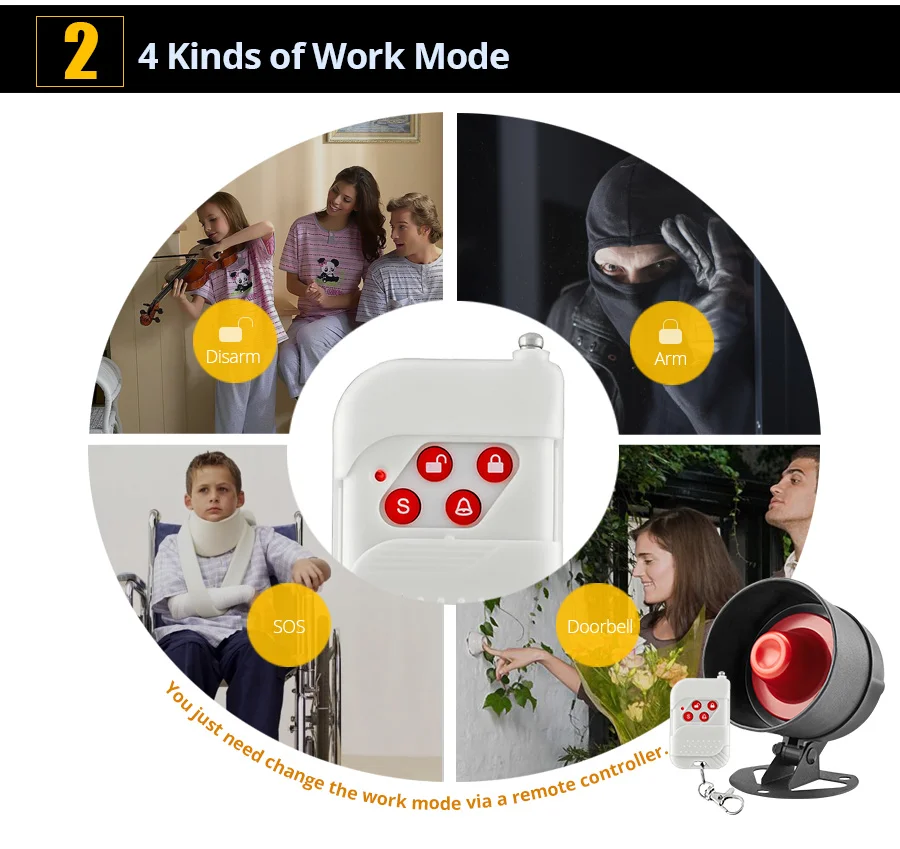 Loud SOS alarm and easy to get help-children and seniors at home in emergency,press the SOS button of the remote controller,which will trigger the siren alarm up to 110db to notice neighbors or other families in home so that they will get help in time.