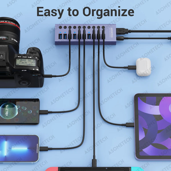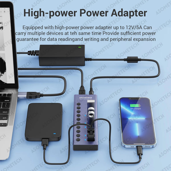 【5Gbps Speed + 60W (12V/5A) Power Adapter】ASOMETECH powered USB hub supports data transfer speed up to 5Gbps and 10X faster than USB 2.0 ports. USB Hub 3.0 is active with a separate 60W (12V/5A) power supply with which multiple USB devices can be operated at the same time. Especially for power-hungry USB devices such as large-capacity external hard drives, please use the power adapter to ensure stable data transfer.