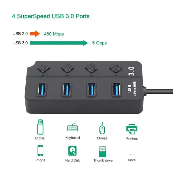 • Multi-Port Design :The HUB USB3.0 USB Splitter 2.0 4-in-1 adapter features a multi-port design, allowing you to connect multiple devices simultaneously.