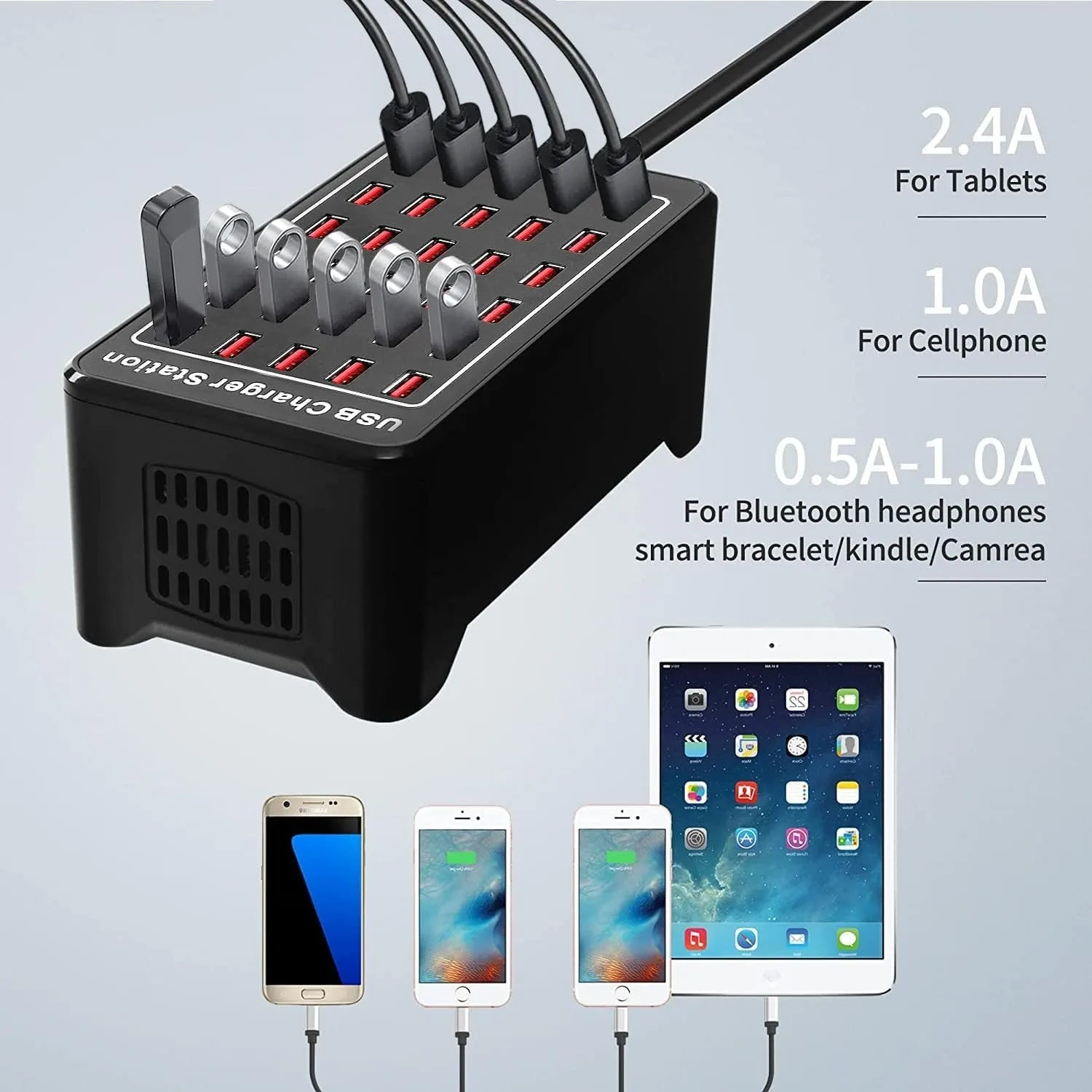 ⚡【20 Ports USB Charger】: 20 USB ports with power up to 100W, can charge 20 different devices at the same time, solving the uncomfortable situation (allows charging speed up to 20 amps between 20 ports or 2.4 amps per port). that there are not enough sockets when charging multiple devices. No other adapters are needed as the device can be charged with only one USB cable.