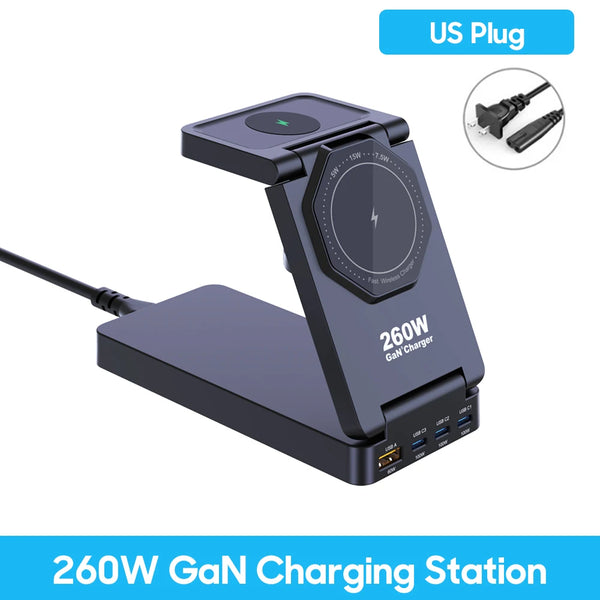 260W Magnetic Wireless Charging Station GaN USB TypeC Charger PPS PD Fast Charge For iPhone 16 15 IWatch AirPods Foldable Holder