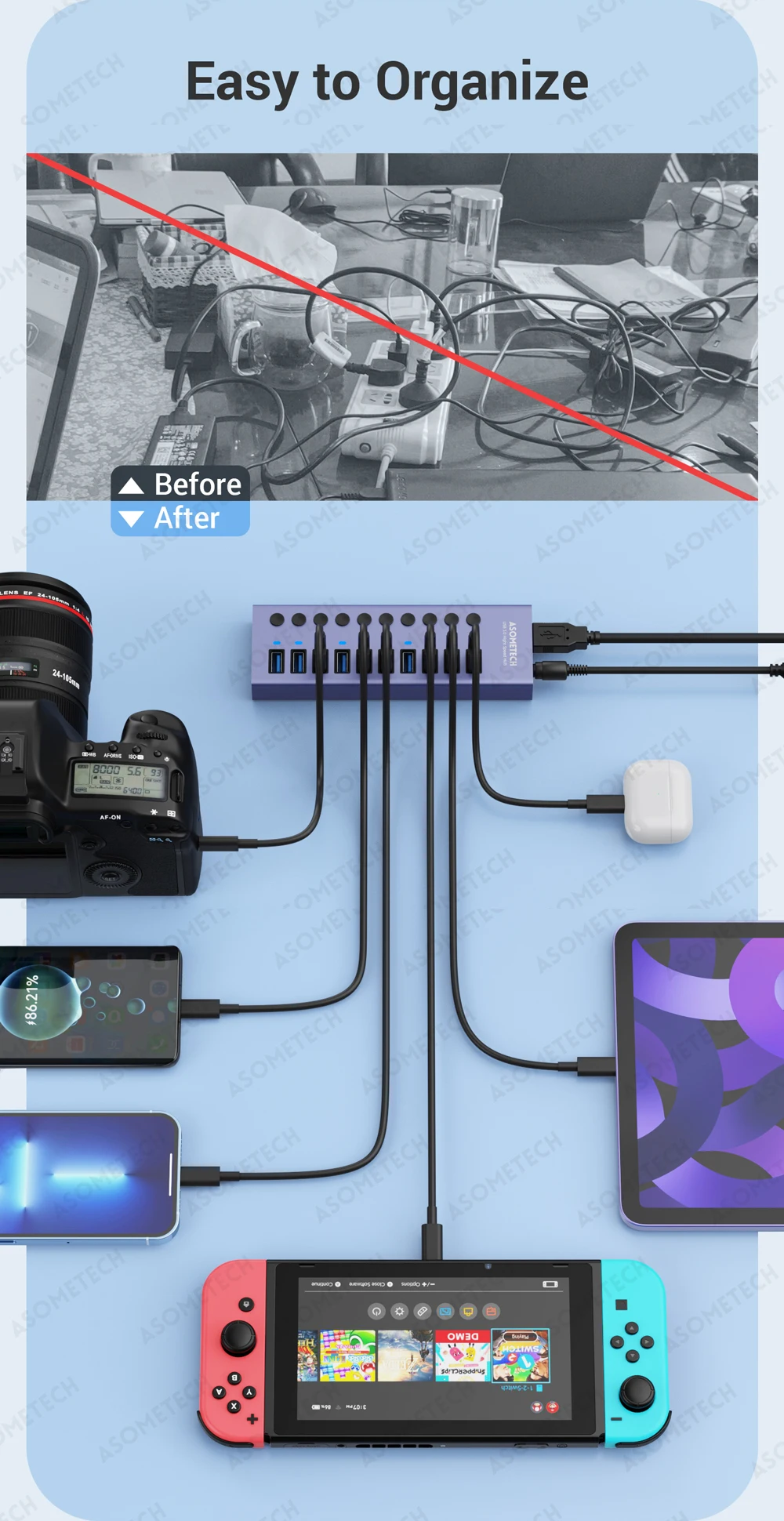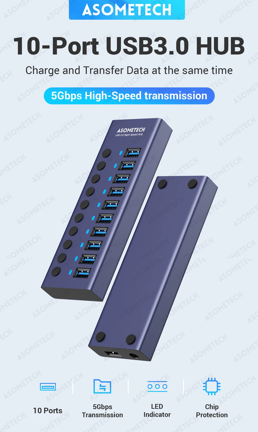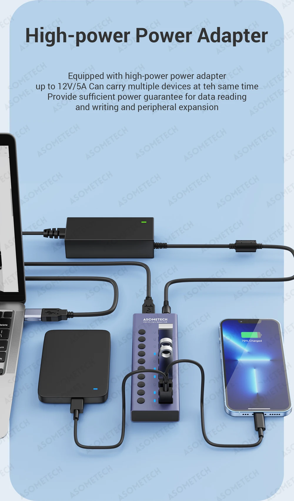【5Gbps Speed + 60W (12V/5A) Power Adapter】ASOMETECH powered USB hub supports data transfer speed up to 5Gbps and 10X faster than USB 2.0 ports. USB Hub 3.0 is active with a separate 60W (12V/5A) power supply with which multiple USB devices can be operated at the same time. Especially for power-hungry USB devices such as large-capacity external hard drives, please use the power adapter to ensure stable data transfer.