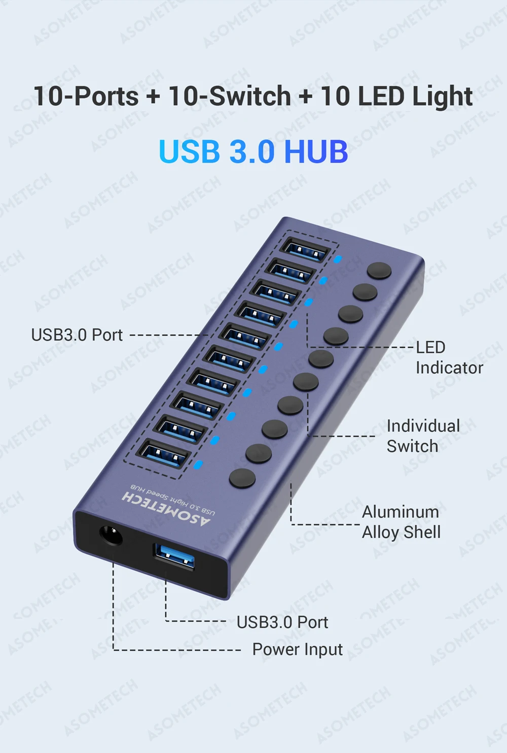 【Aluminum Body + Independent Switch + LED Indicator Light】The USB hub with power adapter is made of metal. Unlike ordinary plastic, it has a high gloss design on the edges that is both strong, durable and beautiful. 10 ports USB 3.0 Splitter have the separate switch and blue LED indicator light. And the blue LED indicator light flickers when data is being transmitted. When power is restored, the ports retain the previously set status.