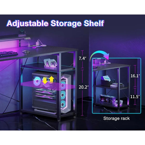 • Flexible Storage Shelves: To accommodate the different space layouts and placement preferences, the gaming desk with storage is designed with a reversible storage shelves. Install them on the left or right based on your preference and room setup. Plus, the middle bord of the storage rack can be adjust to two different height according to your usage needs.